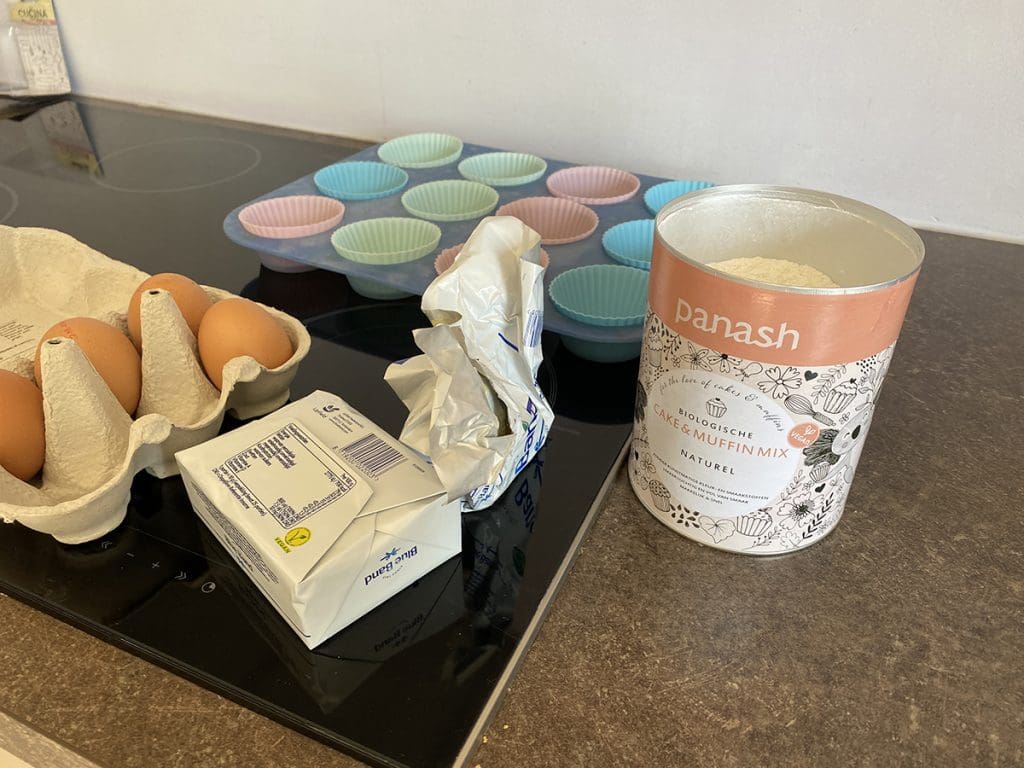 Ik wilde graag muffins maken van de Panash mix die ik een tijdje terug had gekocht. Geen mixer in huis en geen vormpjes. Dus met de mix en al ging ik naar moeders. Die heeft al die spullen wel.