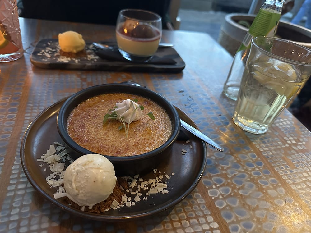 En een heerlijk toetje. Dit was een amaretto crème brulee. Zo lekker!