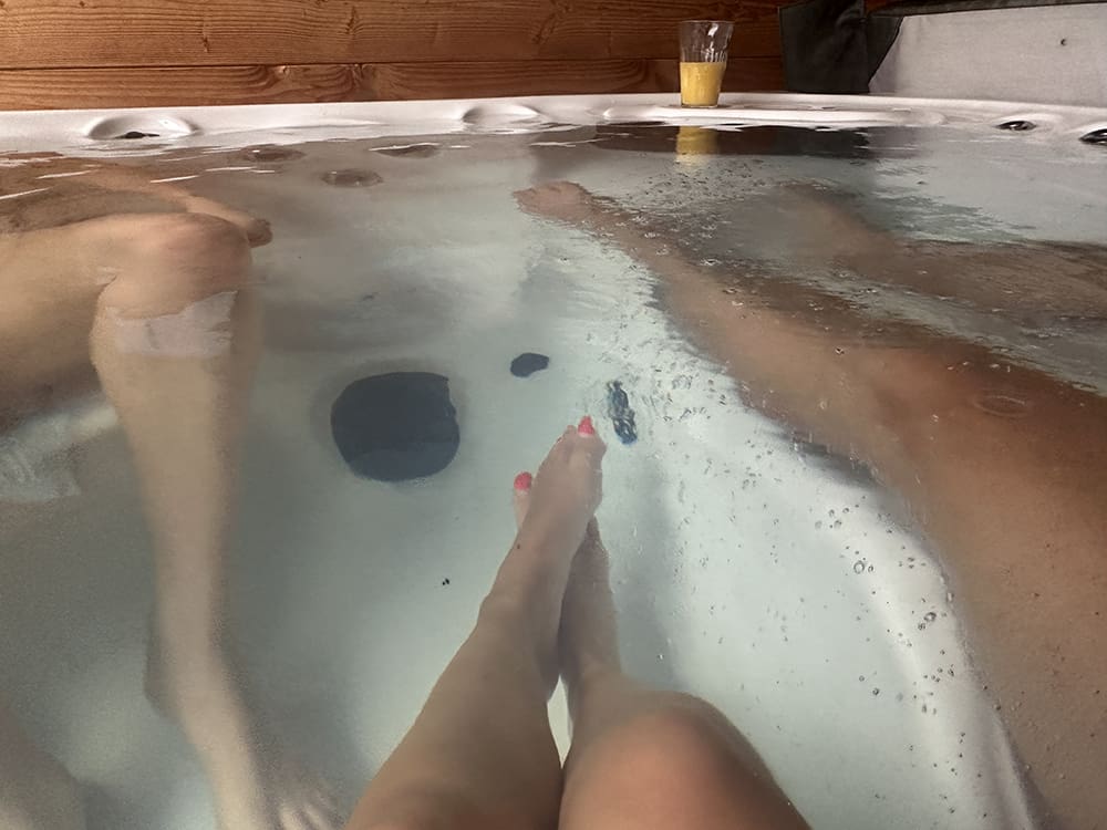 Zaterdag (24 februari). We sliepen uit. Thijs had lekkere broodjes gehaald en daarna zijn we heerlijk in de jacuzzi gegaan.