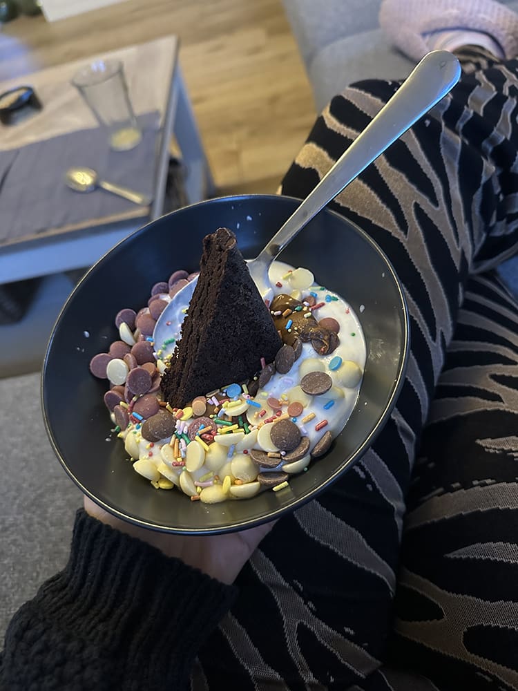 Thijs en ik hebben pizza gegeten en hij had een verrassingstoetje gemaakt, haha.