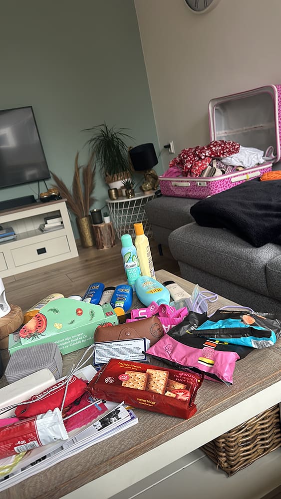 Maar het past! Soort van… wat toiletartikelen gaan bij Thijs in zijn koffer, haha.