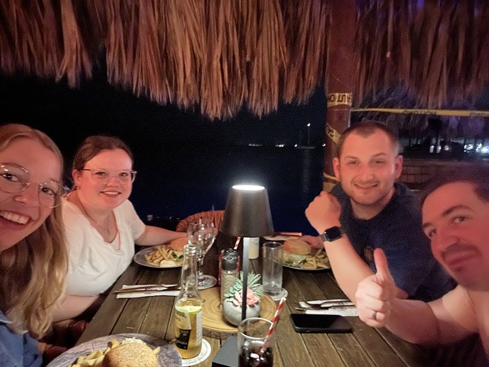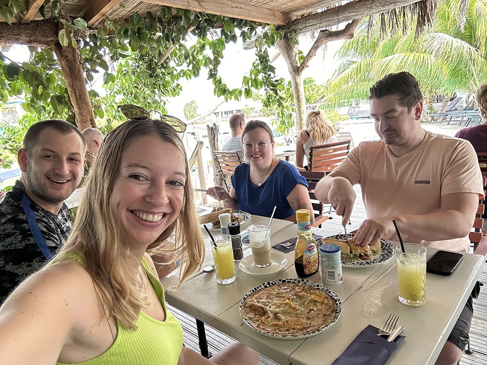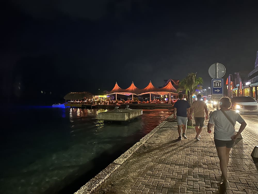 We gaan in Kralendijk lekker wat eten. Super gezellig aan het water.