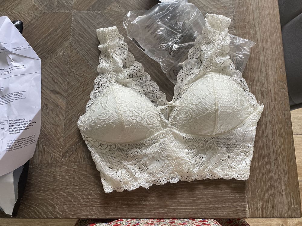Dinsdag (5 juli). Een dag werken op school en daarna thuis mijn pakketje van de Only uitpakken. Ik wil graag een witte bralette. Alleen deze was er niet meer in een S dan gokken we op een M. Helaas…. te groot. Terug sturen dus.