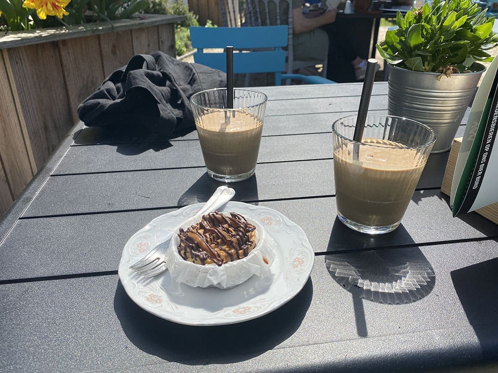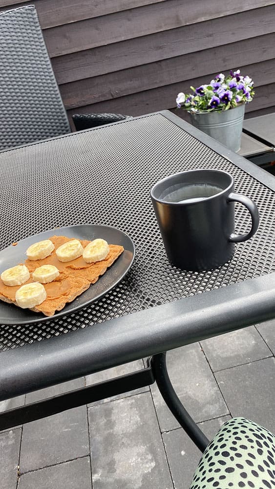 Zaterdag (14 mei). Ik begon de ochtend met sporten. En daarna lekker buiten koffie drinken.