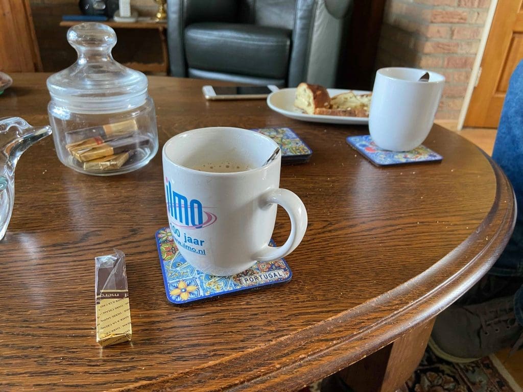 Mijn schoonvader appte of we daarna bij hem even op de koffie kwamen. Gezellig! Hij heeft namelijk wat last van zijn kuit en zit de hele week al thuis… Niet echt iets voor mijn schoonvader, haha.