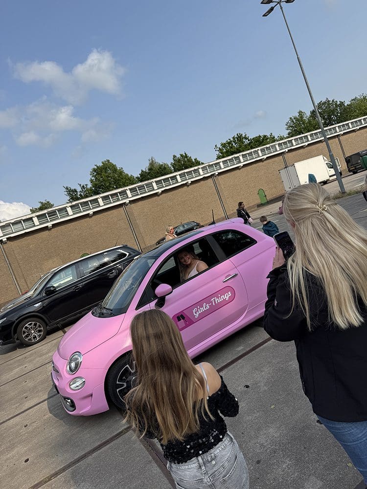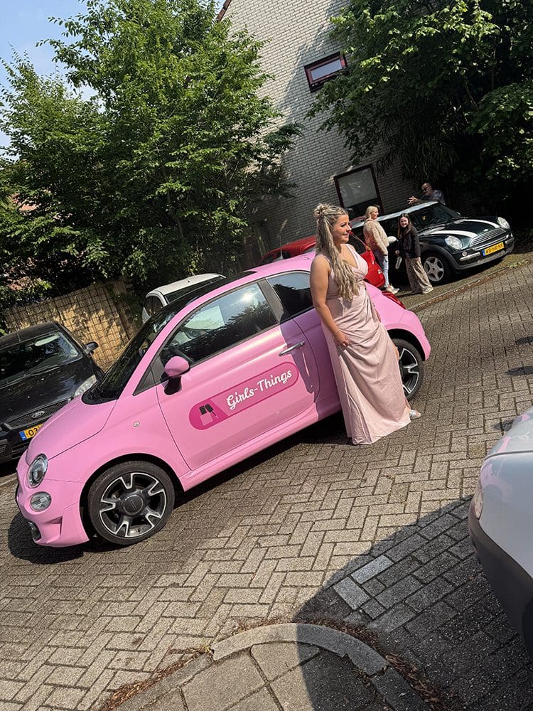 Daarna had heb ik mij omgekleed in een roze outfit. Ik had een aanvraag gehad om deze meid naar haar gala te rijden. Dit was in Apeldoorn. Kijk hoe mooi ze eruit ziet!