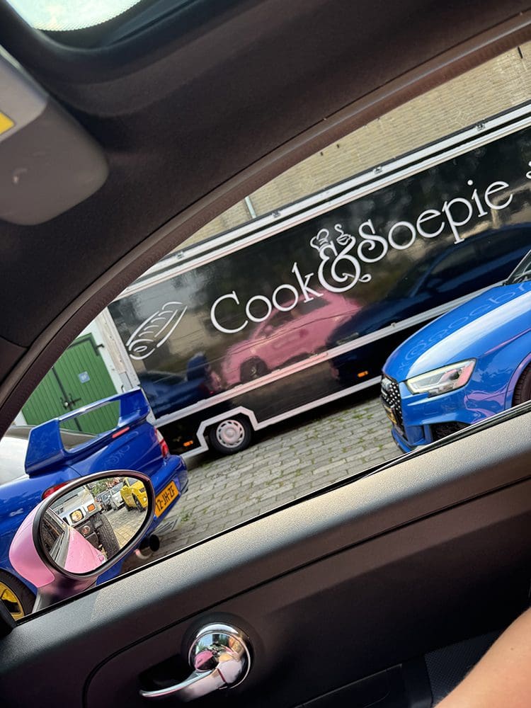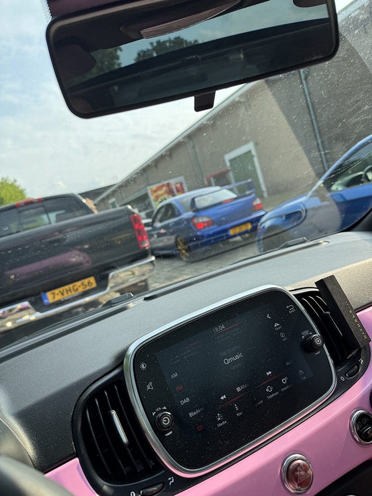 Tussen alle stoere auto’s reed deze roze auto. Geweldig!