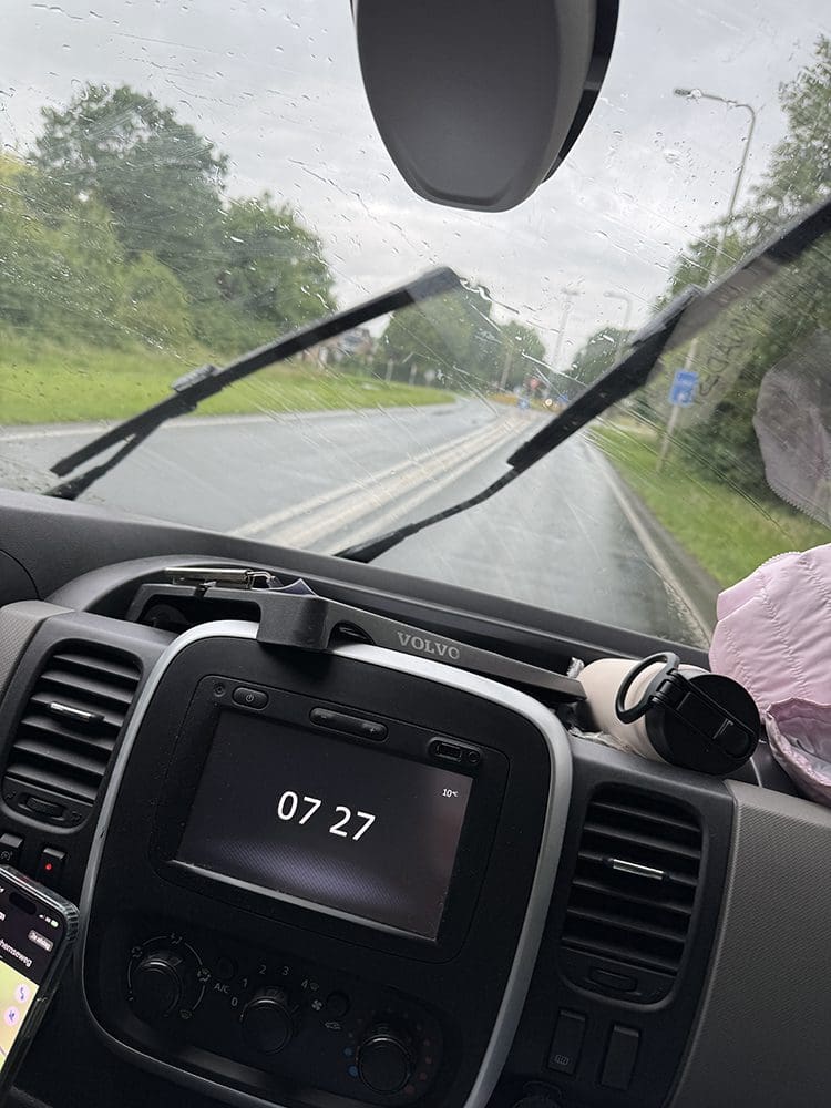 Maar daar staan we! Met een zeil voor de regen want wat een verschrikkelijk weer zeg. De hele dag regen.