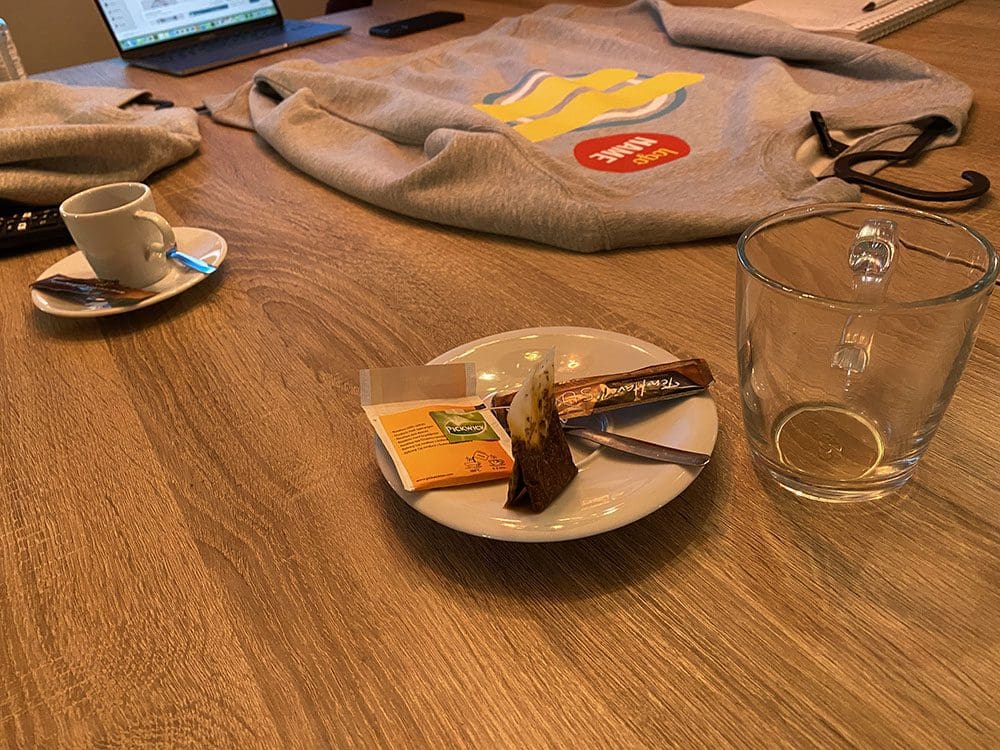 Donderdag (17 februari). Ik werkte de ochtend op school en Thijs had vrij. We hadden een afspraak bij Print.com. Onze drukker van de webshop. Met een koffie gaan we op pad.