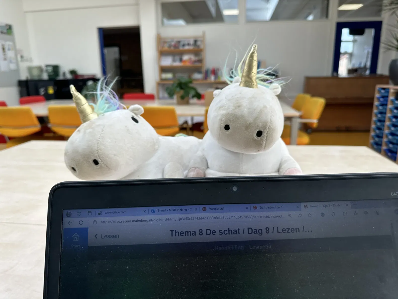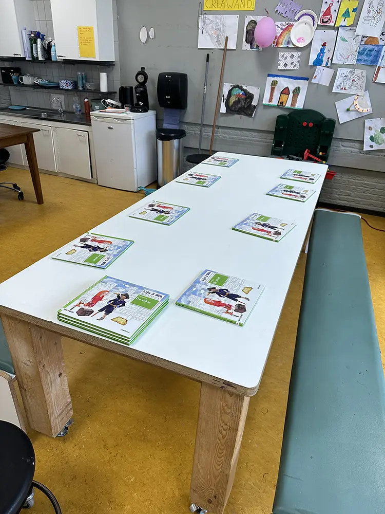 Dinsdag (19 maart). Ik werkte rustig aan op school. Mijn Lijn 3 lessen deed ik in kleinere groepjes. Het lokaal waar ik normaal zit, werd gebruikt voor een voorstelling. Ik kon bij de BSO zitten met de kids. Gezellig aan deze grote tafel.