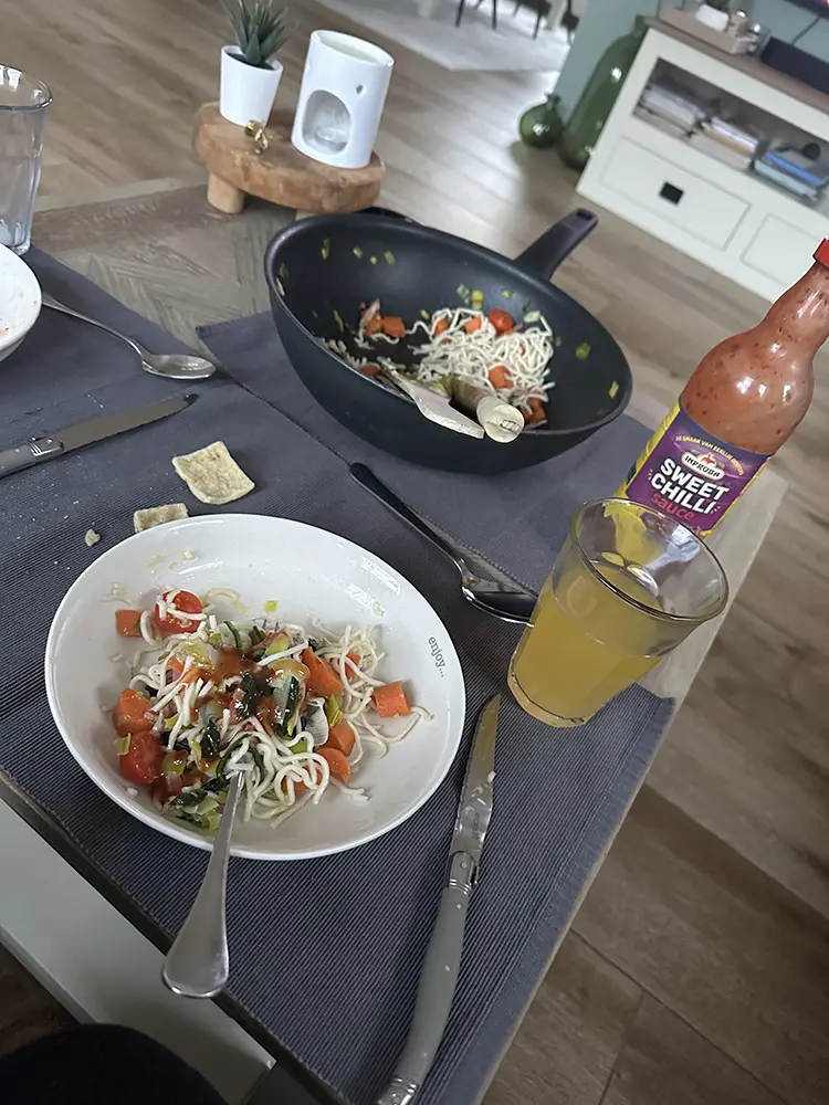 Thijs had een heerlijk avondmaaltijdje gemaakt. Noedels met veel groente.