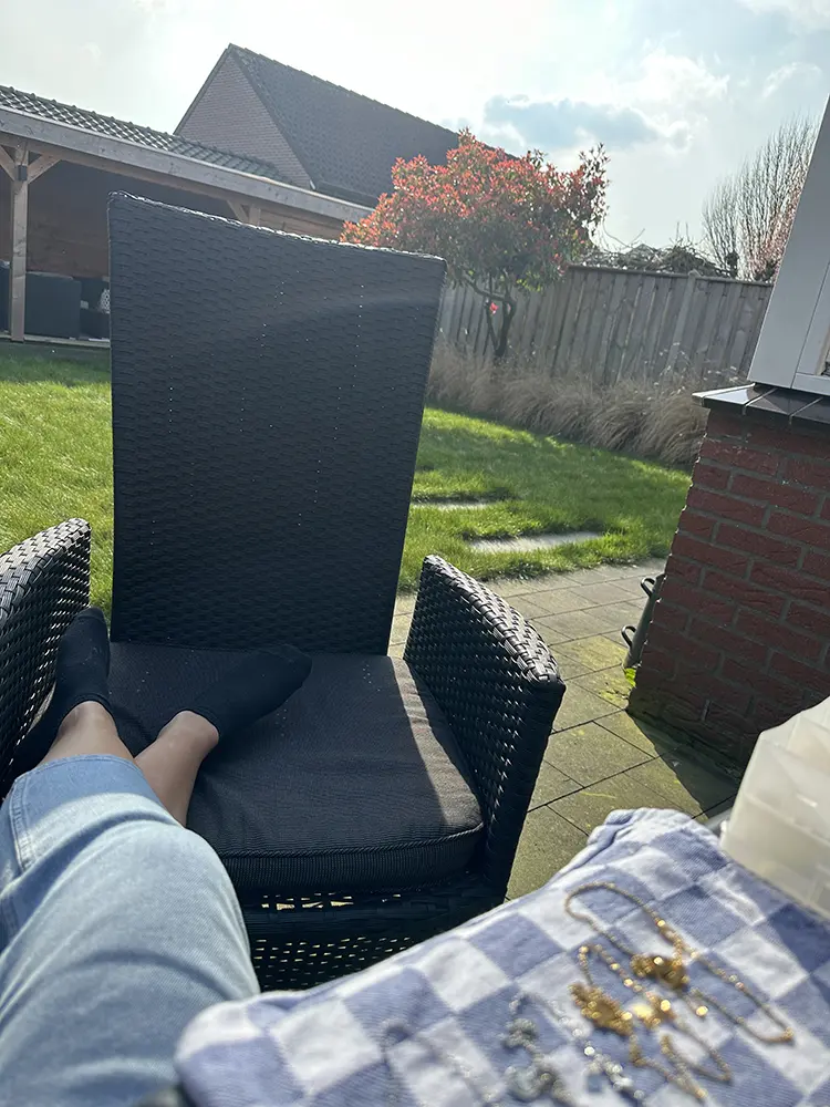 Toen ik thuis kwam, was ik erg moe. Ik heb even op de bank gelegen en daarna buiten een paar sieraden gemaakt.
