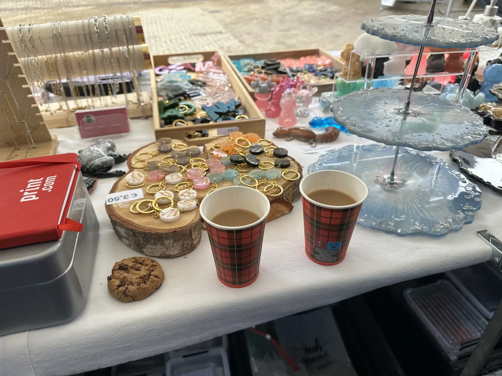 Het was wel een gedoe met de regen en de wind om de kraam op te bouwen. Thijs is nog heen en weer de Gamma gereden voor steviger zeil. Het waaide zo hard dat onze zeilen scheurden. Het was echt geen lente weer helaas. Tijd voor koffie wanneer alles goed staat.