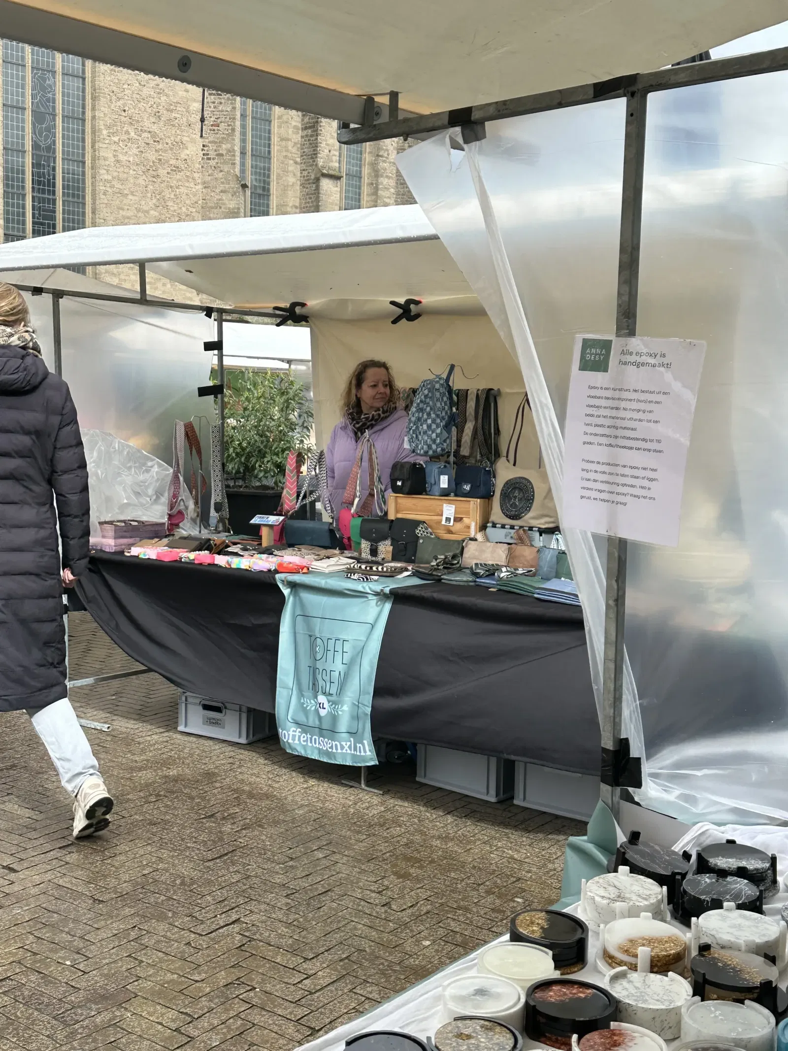 Moeders was even overgelopen, haha. Leandra van Toffe Tassen XL kennen wij heel goed. Ze ging even een rondje lopen dus moeders pastte op haar kraam.