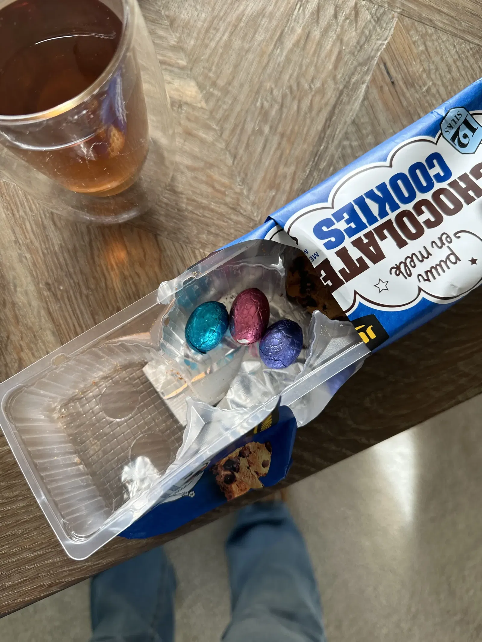 Remco bleef nog even wat drinken bij ons. Lekker paaseitjes erbij.
