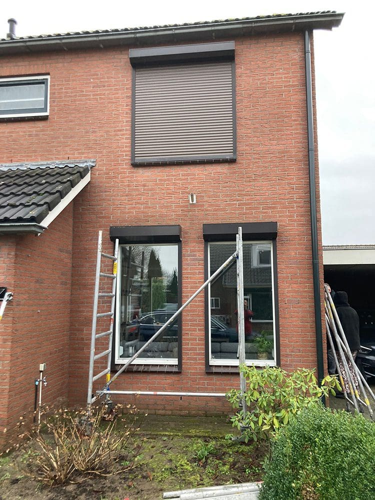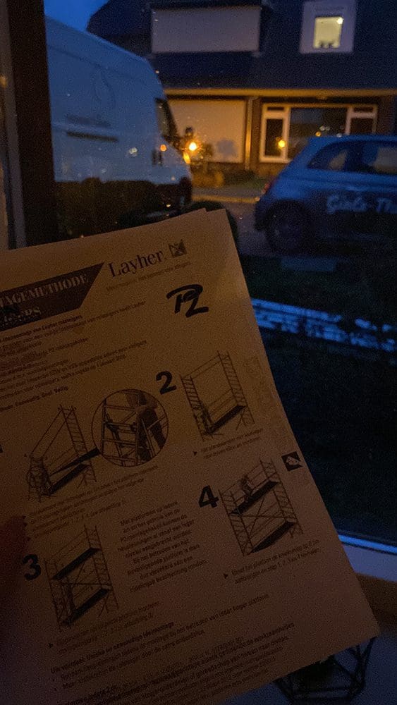 De tuinman heeft voor ons een steiger opgehaald. Deze hebben we de dag erna nodig. Althans: de rolluiken boer die bij ons een rolluik aan de voorkant van het huis komt maken.