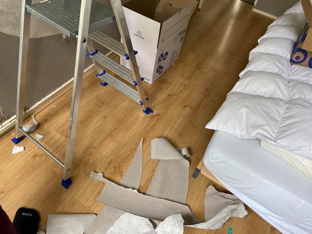 En daarna slopen! Haha. We hebben op een kamer bij Thijs in het appartement het behang eraf gehaald. Hier komen straks mijn spullen: kledingkast, make-up tafel en extra bed. De vloer gaat er dan uit en er komt dus ook ander behang. Een vriend van ons gaat dat doen, maar het scheelt al als wij vast het behang eraf halen.
