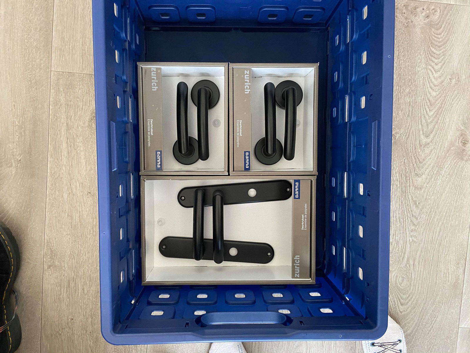 Thijs had ondertussen nieuwe deurklinken gehaald. Staat wel gaaf op een witte deur.