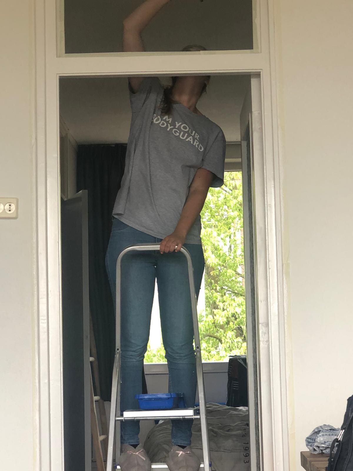 En weer door! Rianne en ik hadden de smaak te pakken en konden best veel deuren doen. De ladder was alleen bezet door de behangers, haha. Dan maar een stoel ingepakt met plastic en nog een theedoek erop.