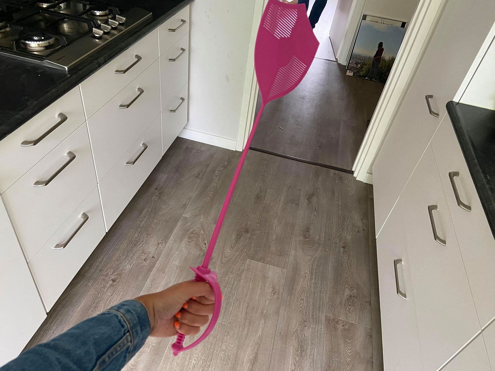 Ik haalde onder andere bij de Action deze geniale vliegenmepper. Het is een zwaard! Wahaha.