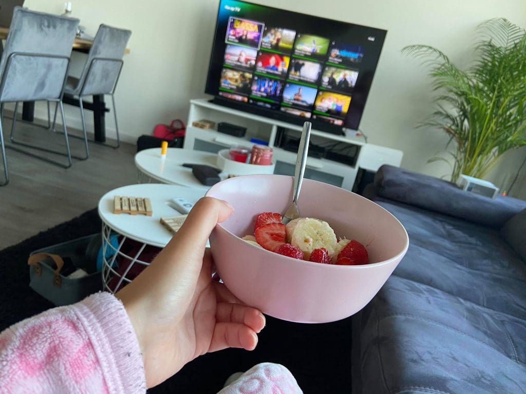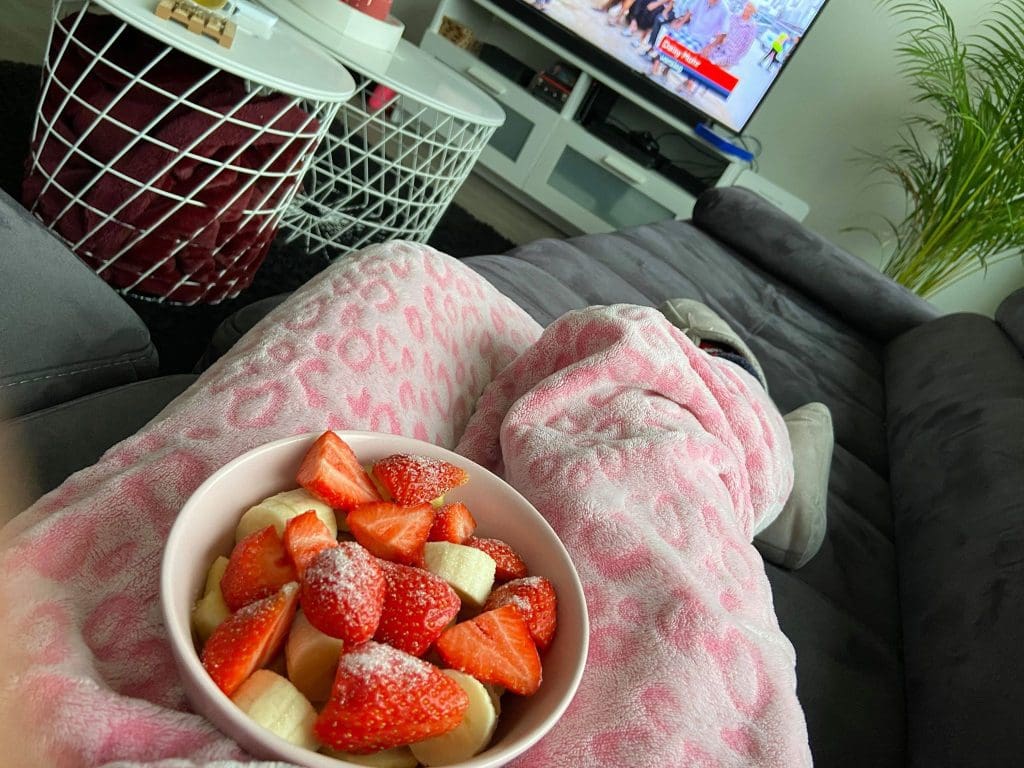Een lekker fruit bakje op de bank en Thijs en ik keken samen gezellig tv.