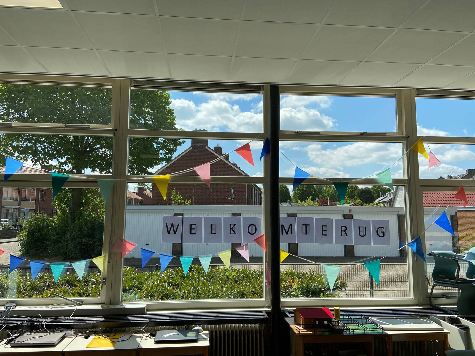 Maandag (4 mei). Ik was die dag met een collega naar school. We moesten het één en ander overleggen en voorbereiden. De klas was nog een rommeltjes en alles ligt nu klaar voor de start na de vakantie. Ik ga namelijk de maandag draaien, omdat een andere collega niet komt (valt in de risico groep).