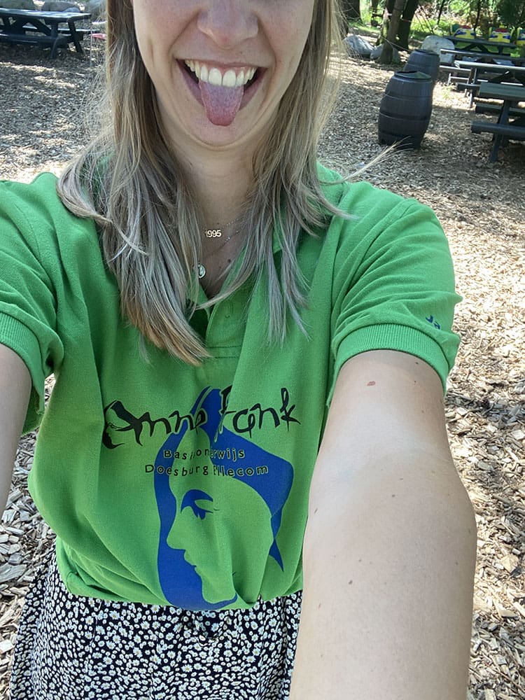 Dinsdag (12 juli). We hadden schoolreisje die dag. Met drie groepen middenbouw naar de Julianatoren. Het was een en al gezelligheid. Blijkbaar moesten wij als leerkrachten ook schoolshirts aan…. Had ik niet op gerekend met een jurkje. Shirt opgeknoopt en dit staat prima.