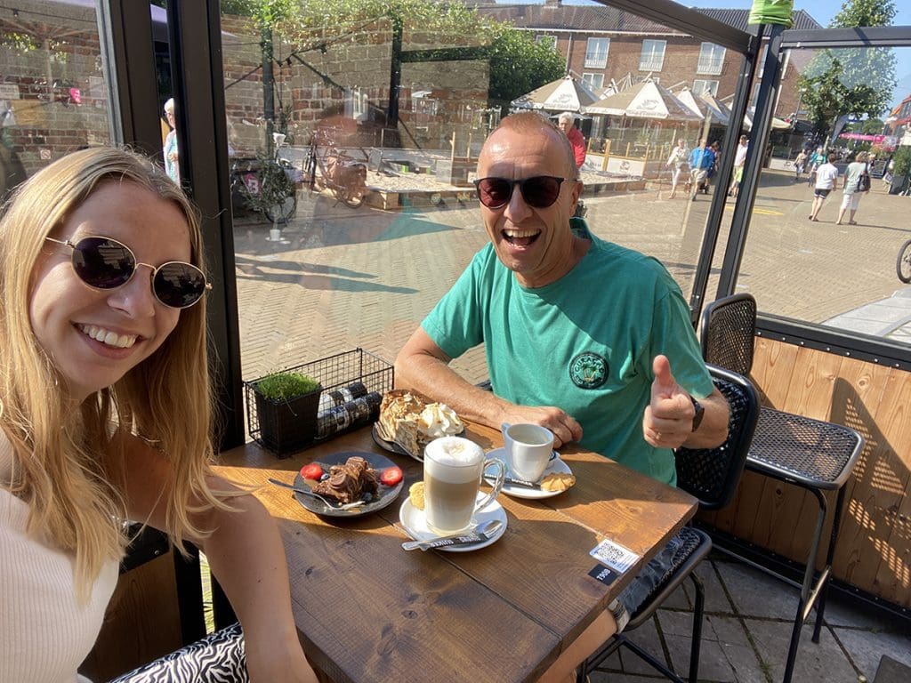 Mijn ouders zijn daar ook om te helpen. Eerst een bak koffie met stroopwafel cake. Lekker!