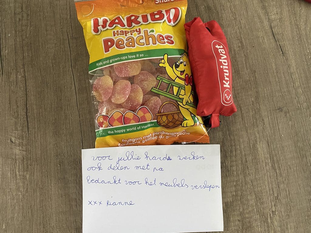 Zaterdag (28 augustus). Een drukke dag. De verhuizers aan het werk! Ik heb samen met Thijs een busje opgehaald en we reden naar Rianne. Daar haalden we wat spullen van haar op die in haar studio komen. De studio waar Theo nu in woont. Hij gaat naar ons appartement en Thijs en ik gaan naar Nieuw-Wehl. En zo schuift de familie door, haha. Rianne was zelf niet thuis maar had dit lieve briefje achter gelaten.