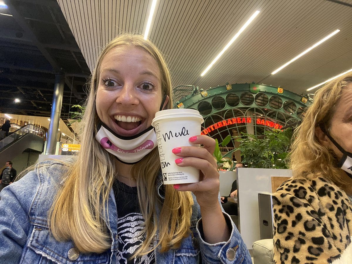 Het is wel een gedoe om eten te halen. Dan moet je mondkapje op. Wanneer je aan tafel zit, dan mag die af. Dit gaat vast nog een keer mis in deze dagen.