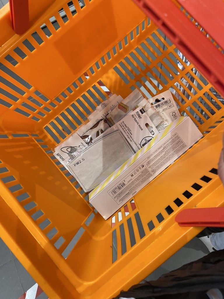De laatste dingen bij de Hema nog halen. Super grappige mondkapjes met rookworsten en tompoucen.