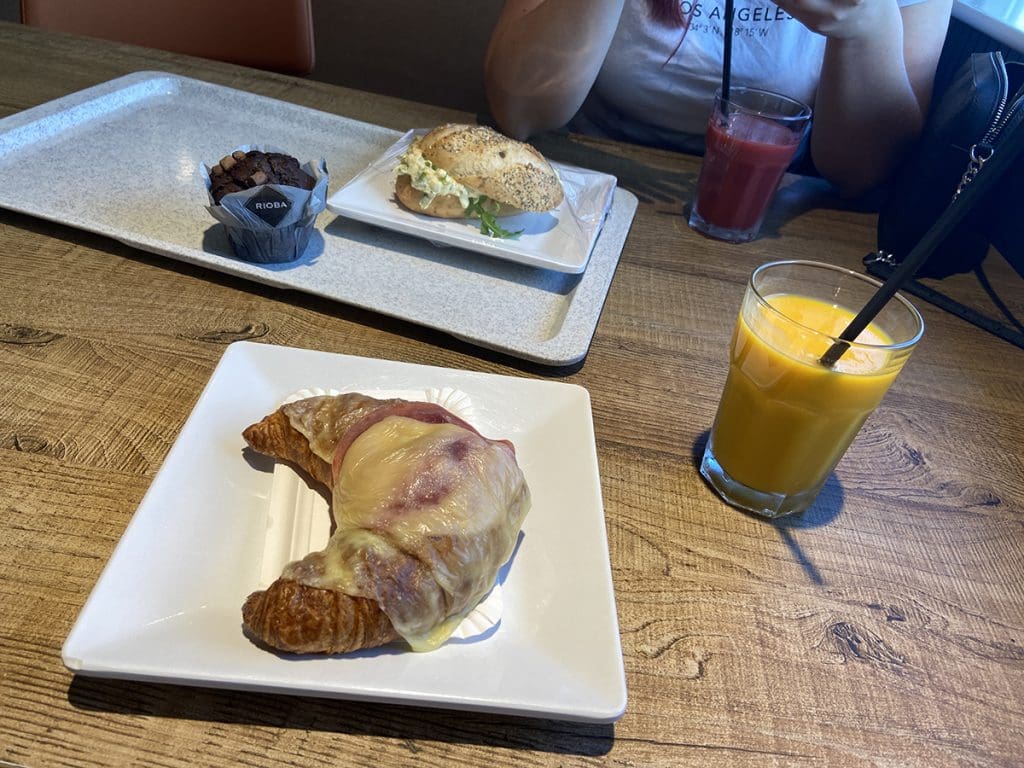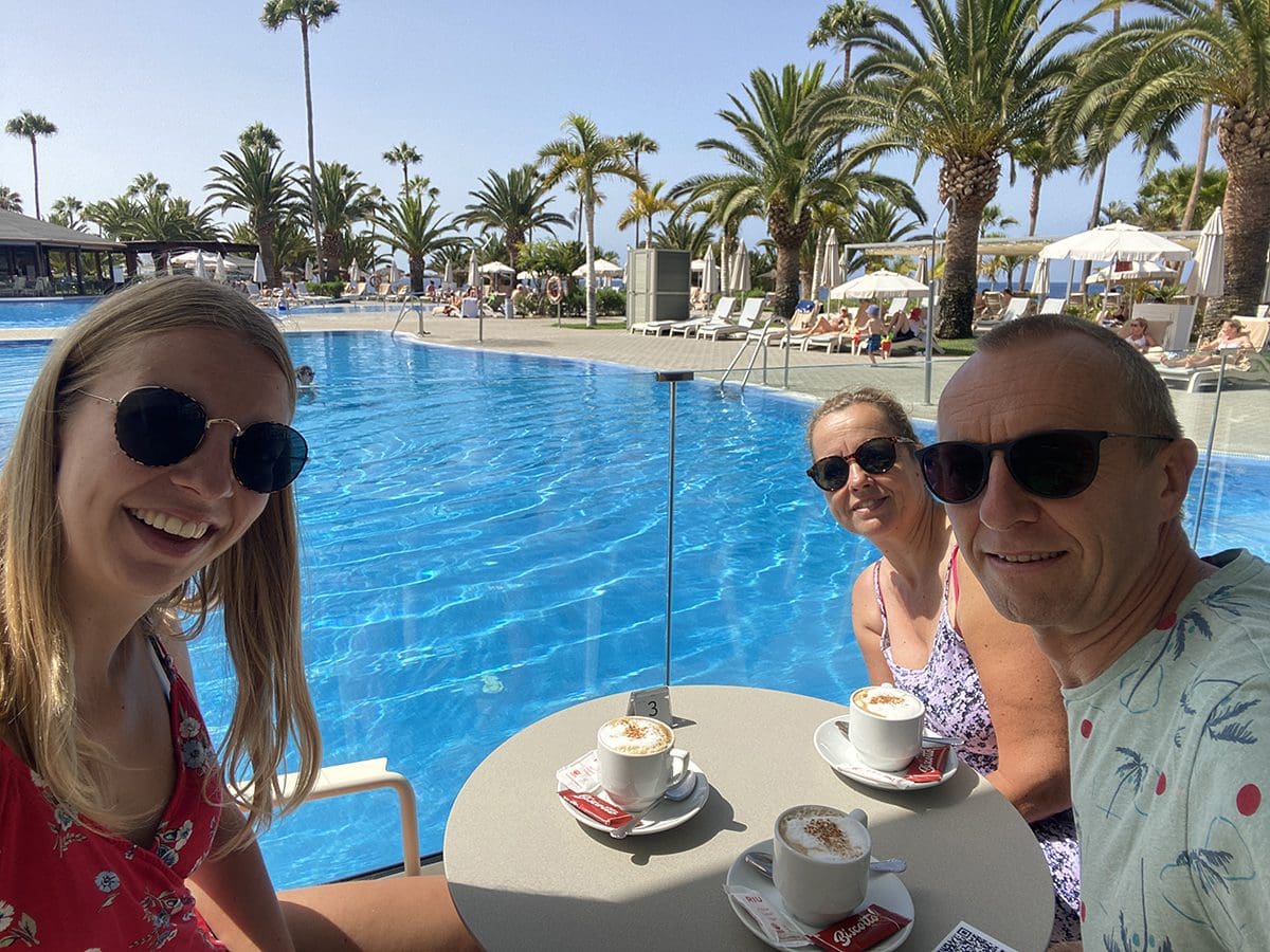 We haalden gelijk in het supermarktje wat water en daarna hebben we de bikini en zwembroek aangetrokken. Eerst lekker een kop koffie bij het zwembad.