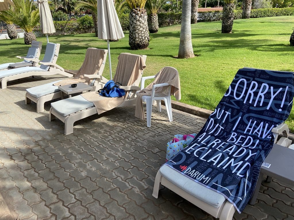 Hier doen ze ook aan handdoekje leggen zoals wij dat noemen. Er is plek zat hoor, maar voor de zekerheid hebben mijn vader en ik vast onze handdoeken klaargelegd. Je kan gewoon een handdoek bij het zwembad van het hotel pakken. Mijn moeder nam ook nog haar eigen handdoek mee van Darum. Altijd lachen.