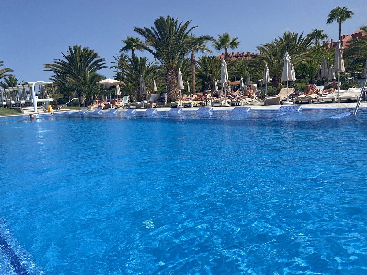 Er zijn drie zwembaden en we lagen bij dit zwembadje met heerlijke ligbedjes erin.
