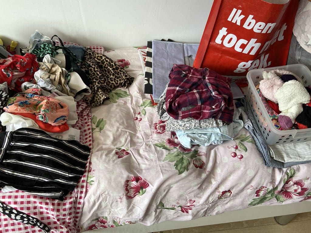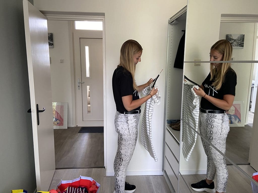 En dan alles in de kast hangen/leggen. Ondertussen moesten we thuis wachten op een pakketje. En daarna reden we terug om deel twee van de kleding op te halen.