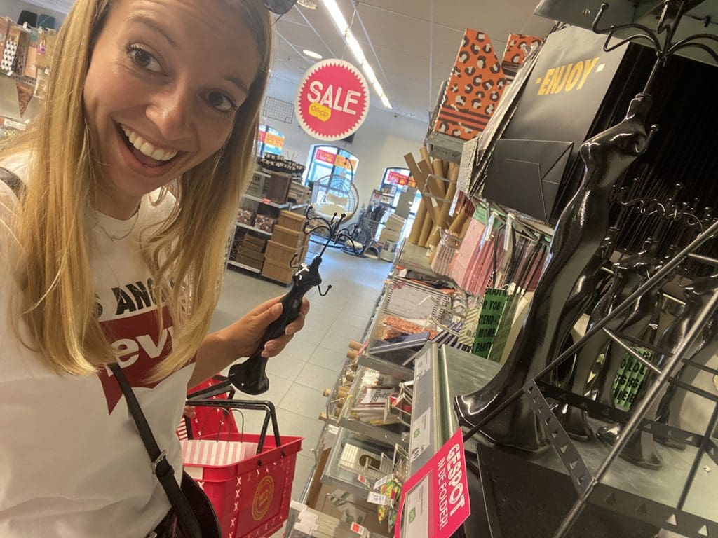Bij de Xenos zag ik leuk sieraden houders. Alleen stonden we wel heel hoog. Ik zag een trapje en klom erop: even mezelf helpen, haha.