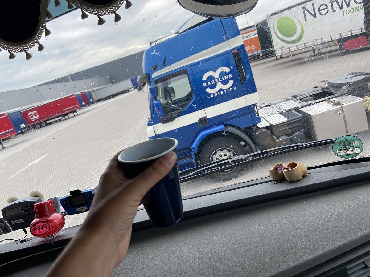 Thijs is bezig de lading uit te laden. Ik mocht niet mee naar binnen. Ik wachtte netjes in de vrachtwagen. Ik plande ondertussen Instagram posts in.