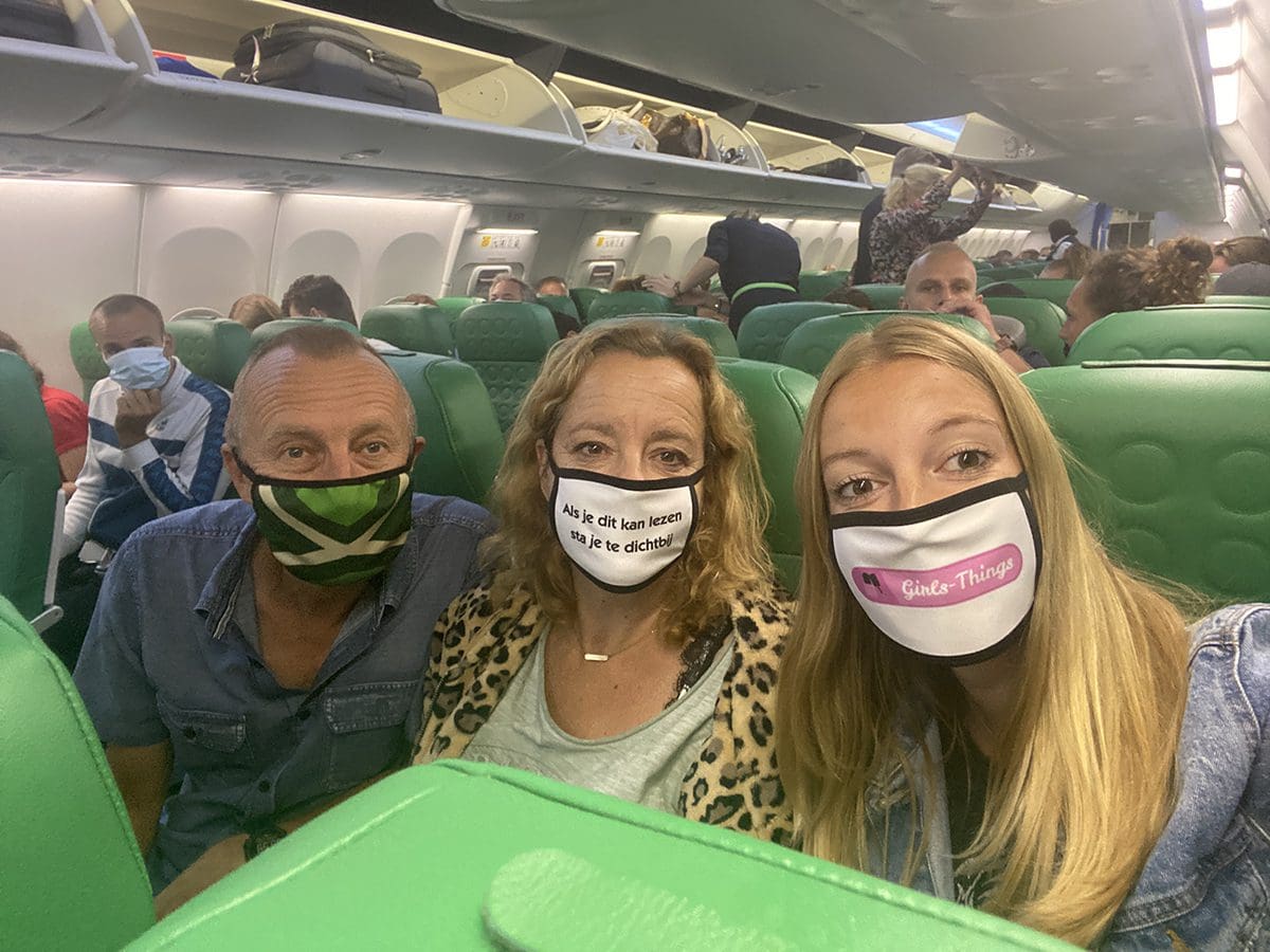 Zondag (26 juli). Half 1 stonden wij al naast ons bed. De vakantie is begonnen! We reden naar Schiphol om op het vliegtuig naar Tenerife te stappen. Tja, met mondkapjes en al.