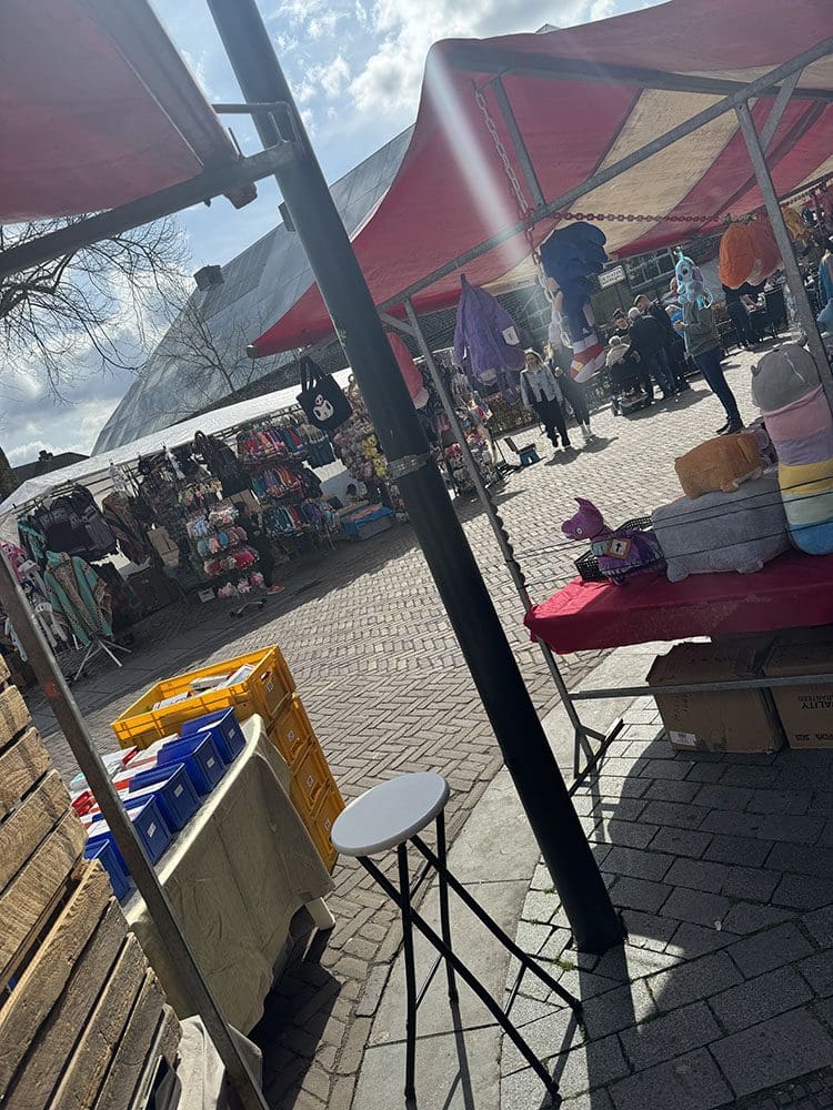 Maar daar staat onze mooie kraam. Het zonnetje scheen zelfs lekker.