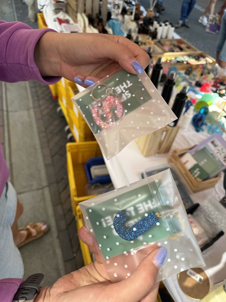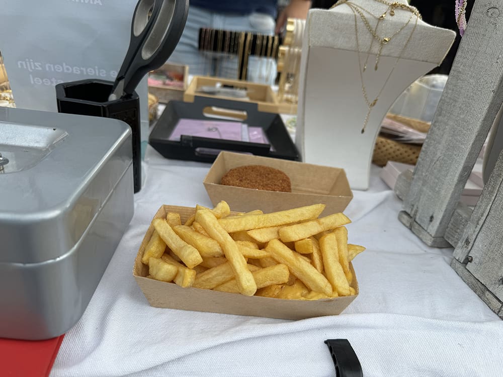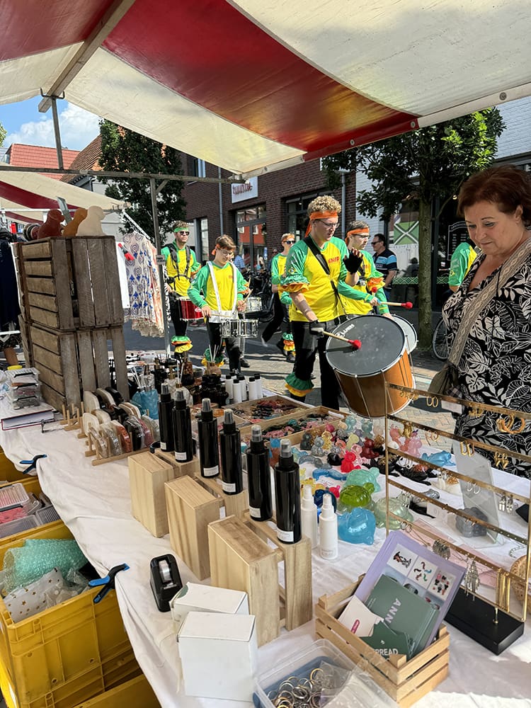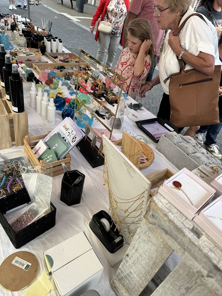 De kraam naast ons bleef leeg. Samen met de buurman heb ik deze opgevuld. Een lege kraam staat zo raar. Naast dat we druk waren met klanten waren we ook druk met Jan de wind. Mijn sieraden waaiden de hele tijd om. Ppff irritant. We hebben alles een beetje vastgezet.