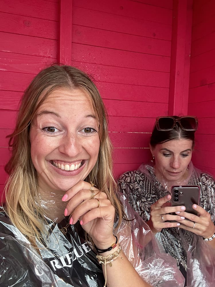 Schuilen was ook nergens te doen. Daan en ik zijn even naar het toilet geweest en vonden daarna een strandhokje. De erge regen en wind was nu wel weg. We waren helemaal nat. Alles.
