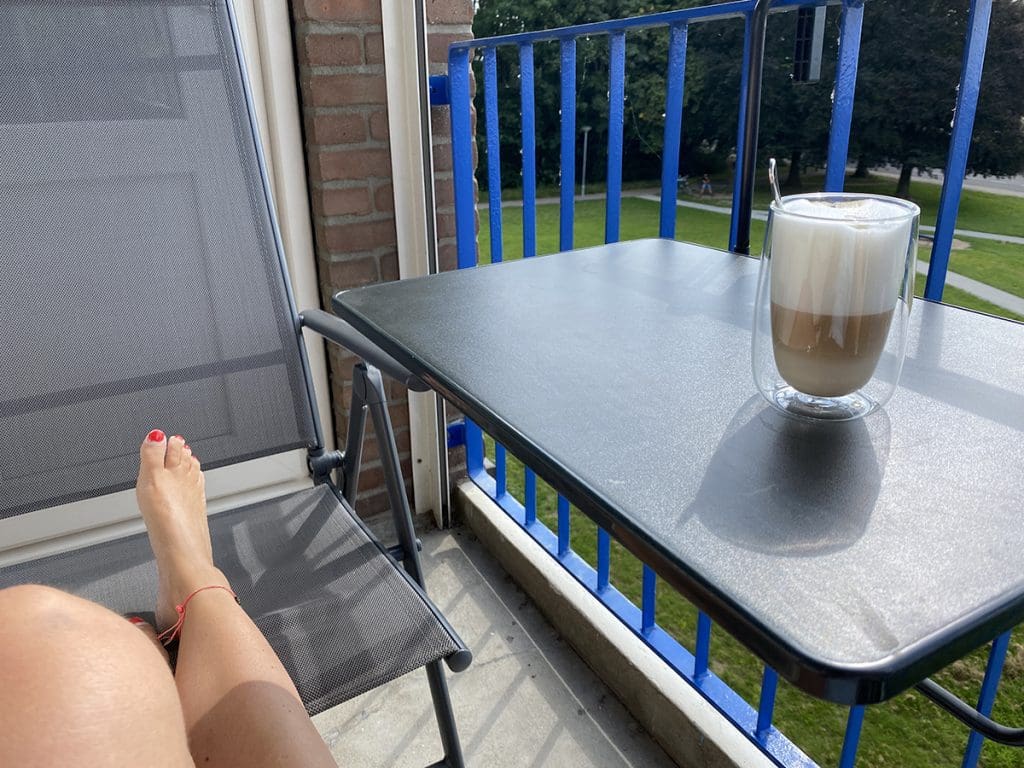 Vrijdag (23 juli). Ik sliep uit. Ik was moe van de vorige dag. Heerlijk koffie op het balkon. Ja, het vakantiegevoel zit er al in.
