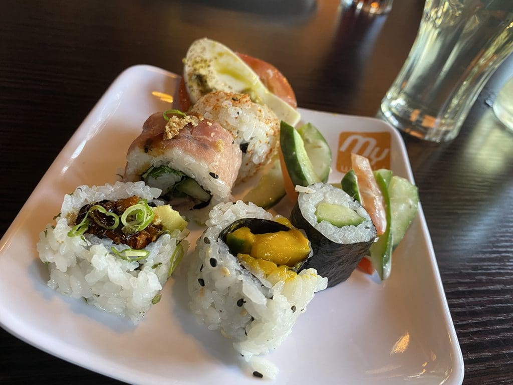 We aten sushi. Deze kwamen van de Sushi Boys. Mmhh echt goede en lekkere sushi.