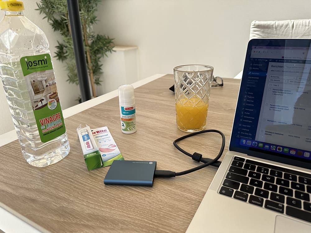 Dinsdag (23 juli). We zijn nog in het mooie Spanje. Na een lekker ontbijt werk ik wat achter de laptop. En ondertussen smeer ik mijn muggenbulten in. Ik ben flink gestoken en heb van de apotheker daar ook een zalfje ervoor gekregen.