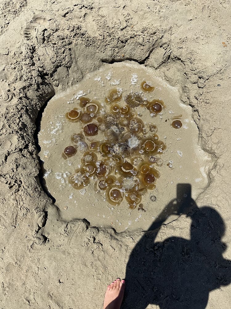 Ik dacht: zullen misschien wel minder kwallen zijn…. Nou…. In vergelijking met de andere strandjes waren er hier wel minder. Een meneer was ze aan het vangen en heeft ze bij elkaar in deze kuil gedaan, haha.