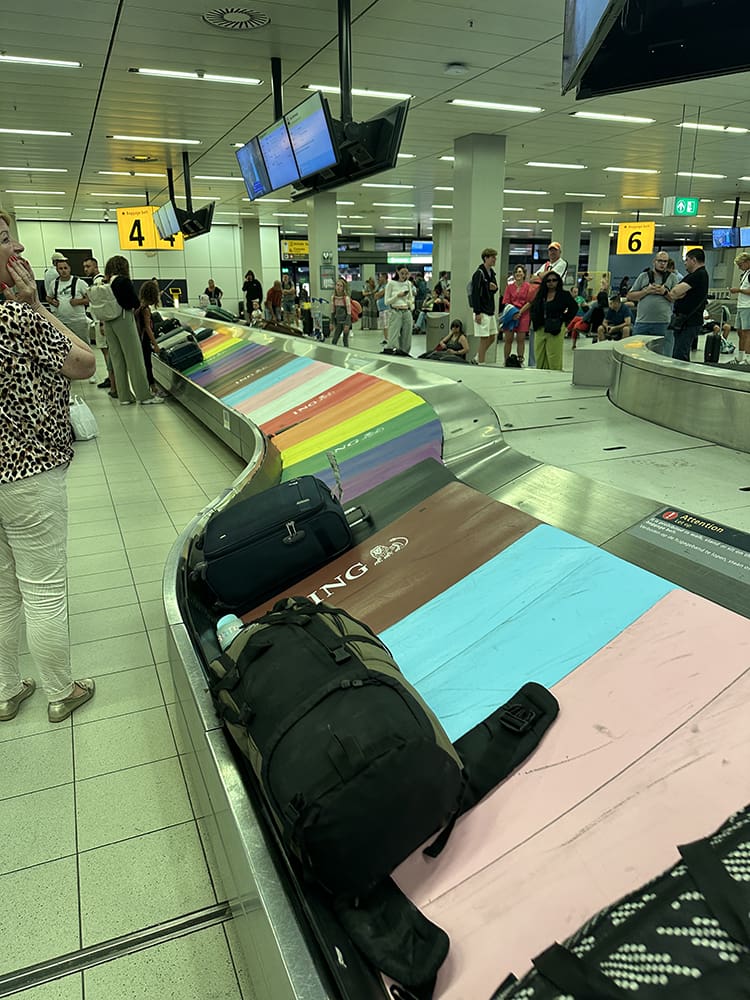 Kijk deze vrolijk gekleurde bagageband op Schiphol. Onze koffers pakken en op naar huis. We kwamen laat in de avond aan. Ik heb mijn koffer uitgepakt en daarna lekker slapen.