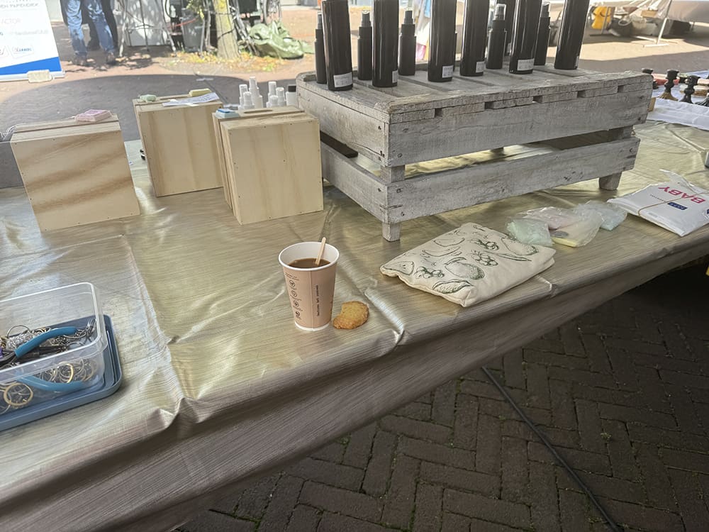 Alles opgezet en om 12 uur stonden we klaar voor de markt. We mochten zelf koffie pakken met een koekje. Super lief.