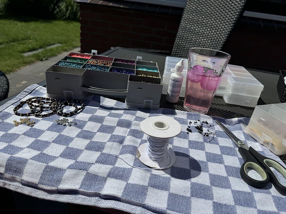 Lekker in het zonnetje armbandjes maken.
