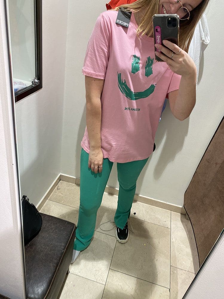 Ik had nog een cadeaubon van mijn schoonvader. Deze kon ik onder andere inleveren bij The Pieces. En daar zag ik deze leuke broek en een shirt. In het echt zijn de kleuren feller dan op de foto.