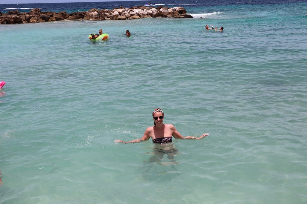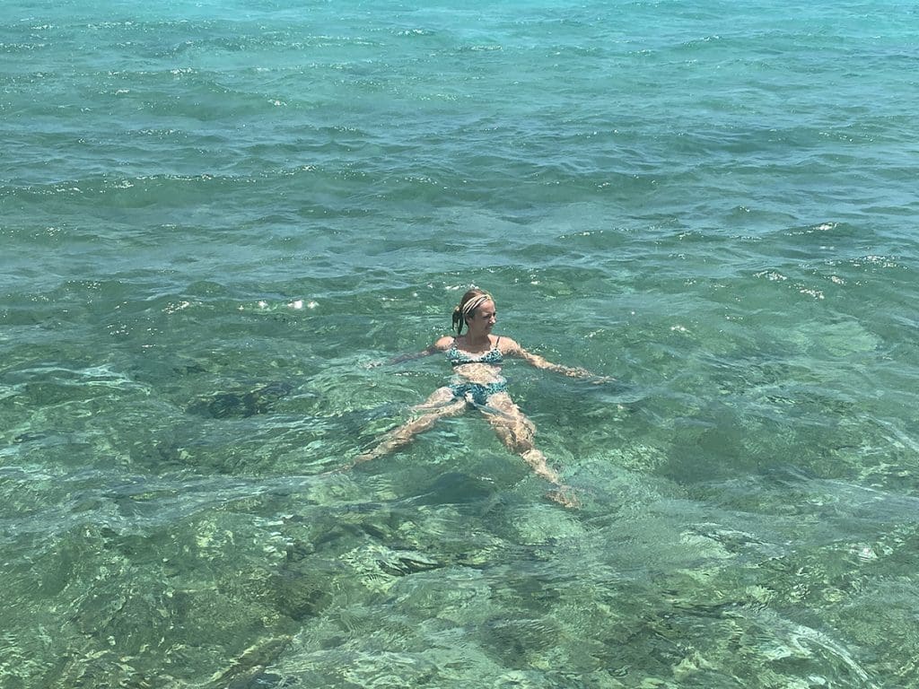 En tussendoor de zee in. Het water is hier zo helder. Je ziet de visjes zwemmen!